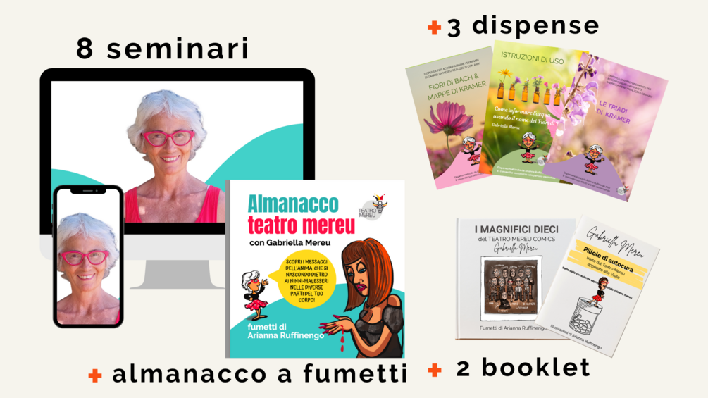 p.s. Tutto il materiale che trovi nel pacchetto rientra nella poetica del Teatro Mereu, uno strumento per approfondire la conoscenza di te stesso attraverso i malesseri. Non va a sostituire in nessun caso il parere del tuo medico curante, se ne hai uno, a cui ti consigliamo di continuare a fare riferimento.